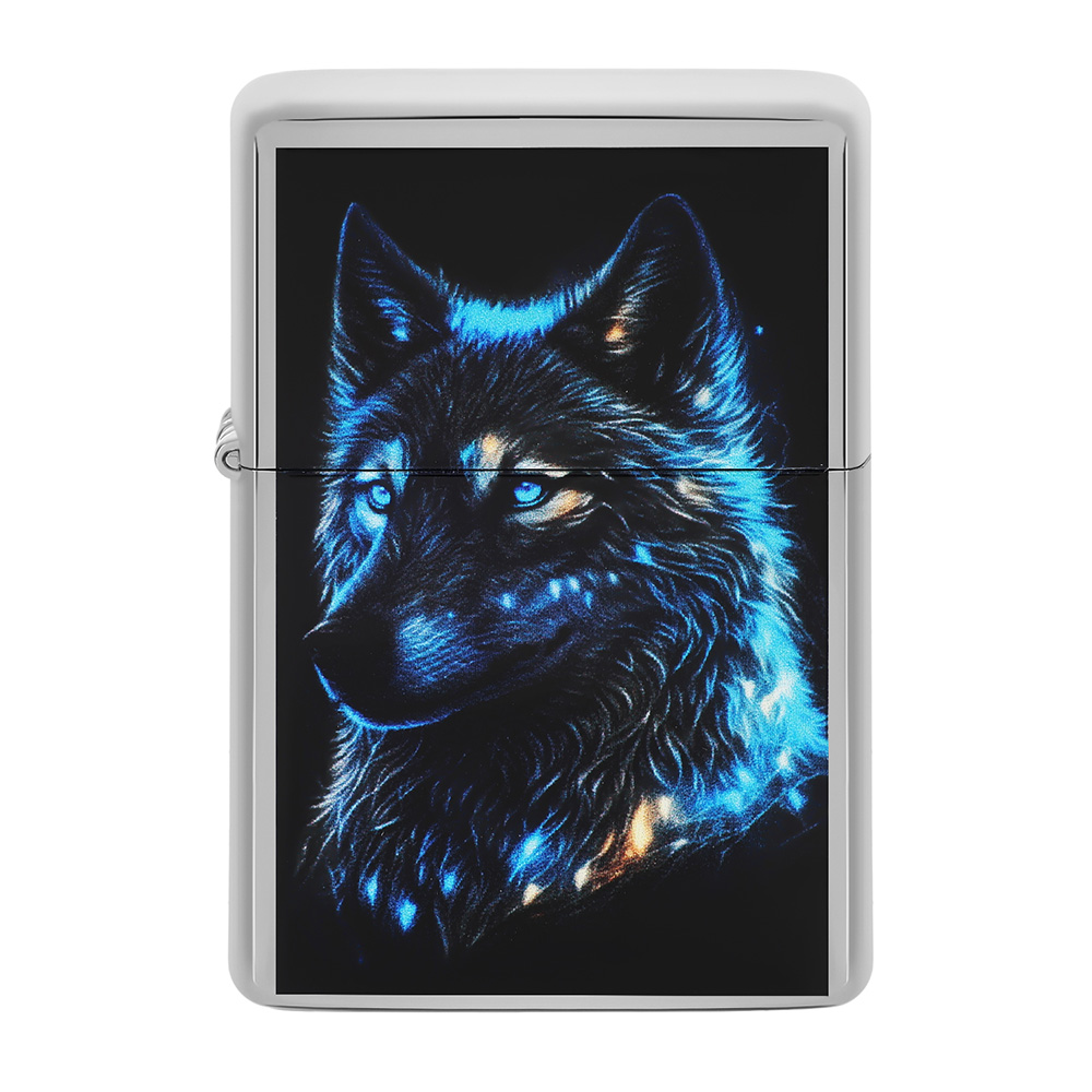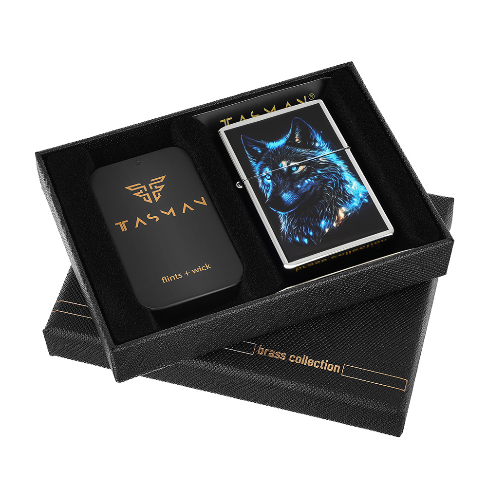 Ta niezwykła zapalniczka z mosiądzu to prawdziwe arcydzieło designu i rzemiosła. Jej lśniąca, złota obudowa zachwyca i emanuje luksusem. Ale to nie wszystko! Na powierzchni zapalniczki wzrok przyciąga tajemniczy błękitny wilk.